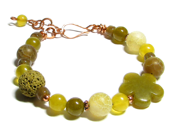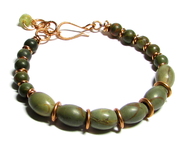 ljus olivgrön glaspärla som avslut. Mellandelarna är