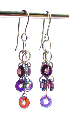 Örhängen av glasringar i lila och regnbågstoner